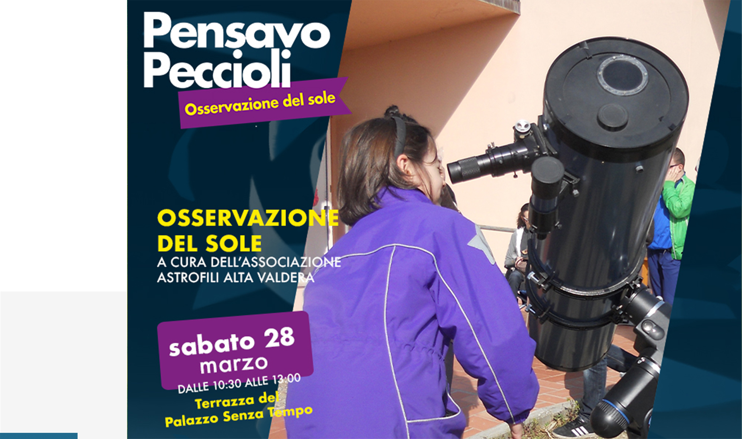 Attività di osservazione del sole sulla terrazza di Palazzo Senza Tempo, organizzata dall’Associazione Astrofili Alta Valdera. Con i telescopi dell’associazione, dotati di appositi filtri solari, sarà possibile osservare le macchie solari e, grazie ai filtri Coronado, anche le spettacolari protuberanze della superficie del Sole.